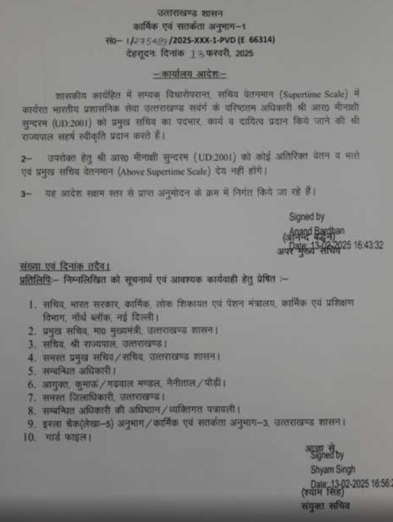 आईएएस अधिकारी आर मीनाक्षी सुंदरम 2001 बैच के अफसर है। आर मीनाक्षी सुंदरम जनवरी 2026 में अपनी 25 साल की सेवा पूरी कर रहे हैं। ऐसे में उत्तराखंड सरकार ने आईएएस अधिकारी को सेवा अवधि में कुछ महीनों की शिथिलता देते हुए प्रमोशन का आदेश जारी किया है।