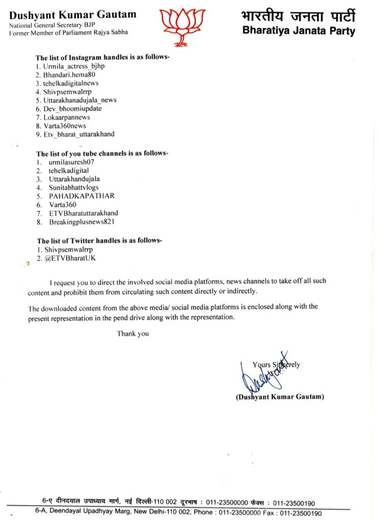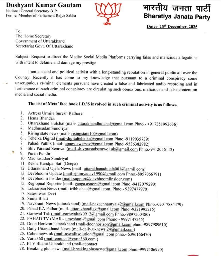 देहरादून। उत्तराखंड के चर्चित अंकिता भंडारी हत्याकांड में वीआईपी के तौर पर नाम जोड़ने पर भाजपा के राष्ट्रीय महासचिव और उत्तराखंड के प्रभारी दुष्यंत कुमार गौतम ने उत्तराखंड के गृह सचिव को पत्र लिखा है। इसमें 9 इंस्टा हैंडल, 8 चैनल और 2 एक्स एकाउंट पर छवि खराब करने का आरोप लगाए हैं।