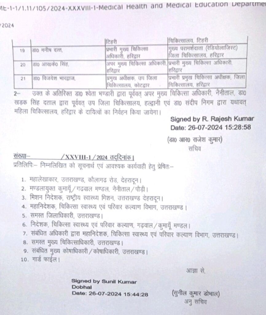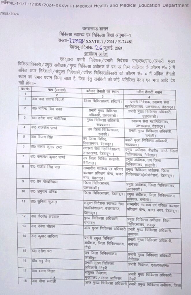 देहरादून। उत्तराखंड स्वास्थ्य विभाग में बड़ा फेर बदल हुआ है शासन ने 21 स्वास्थ्य विभाग के अधिकारियों के तबादला आदेश जारी कर दिए है। सचिव स्वास्थ्य आर राजेश कुमार के आदेश जारी कर सभी अधिकारियों को तत्काल नवीन तैनाती स्थल पर ज्वाइन करने के निर्देश दिए गए है।