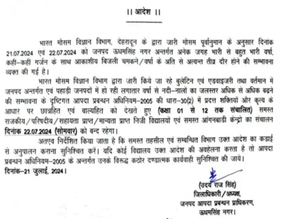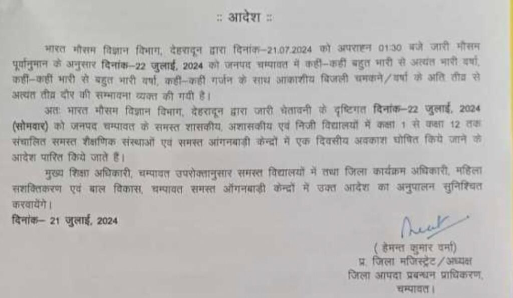 देहरादून। राज्य में बारिश का दौर जारी है मौसम विज्ञान केंद्र के अनुसार 22 जुलाई सोमवार को भी राज्य के अनेक जनपदों में भारी से बहुत भारी बारिश की संभावना है। जिसको लेकर कुमाऊं मंडल के चंपावत और उधम सिंह नगर जिले में 22 जुलाई सोमवार को कक्षा 1 से 12 तक के सभी स्कूल और आंगनबाड़ी केंद्रों में अवकाश के आदेश जारी कर दिए गए हैं।