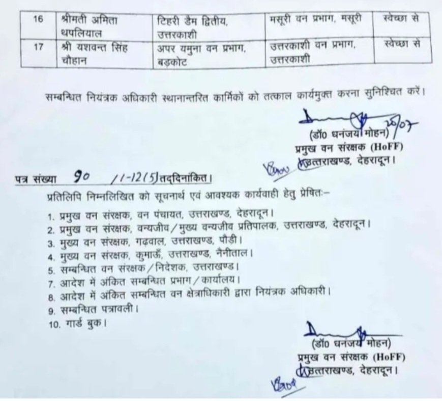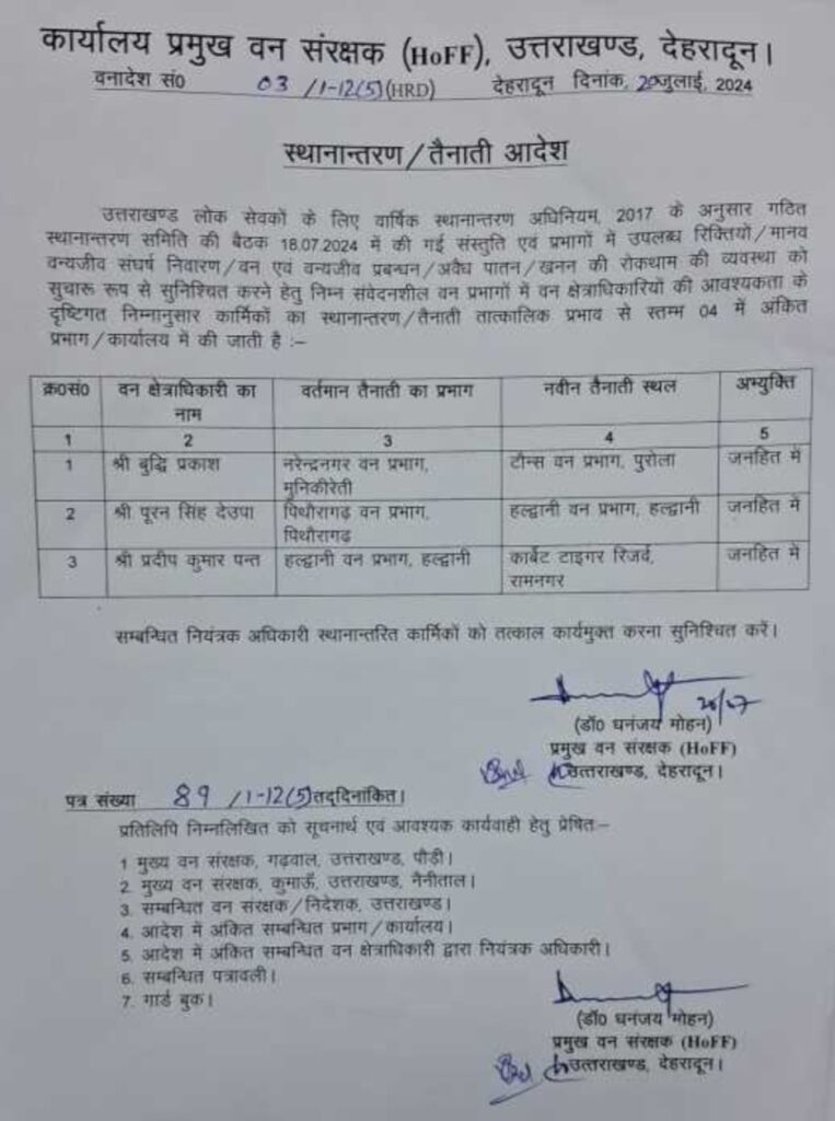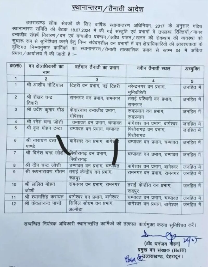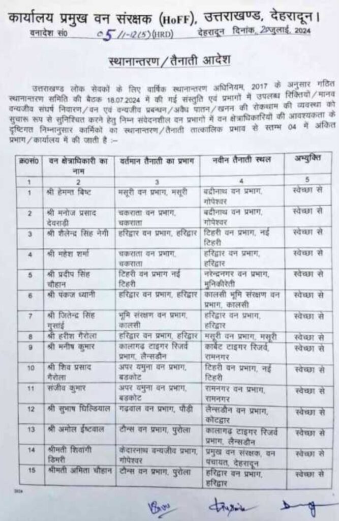 देहरादून। वन मुख्यालय देहरादून से बड़ी खबर है उत्तराखंड वन विभाग में 32 वन क्षेत्राधिकारियों के तबादले किए गए हैं। जिसकी पहली सूची जारी की गई है।