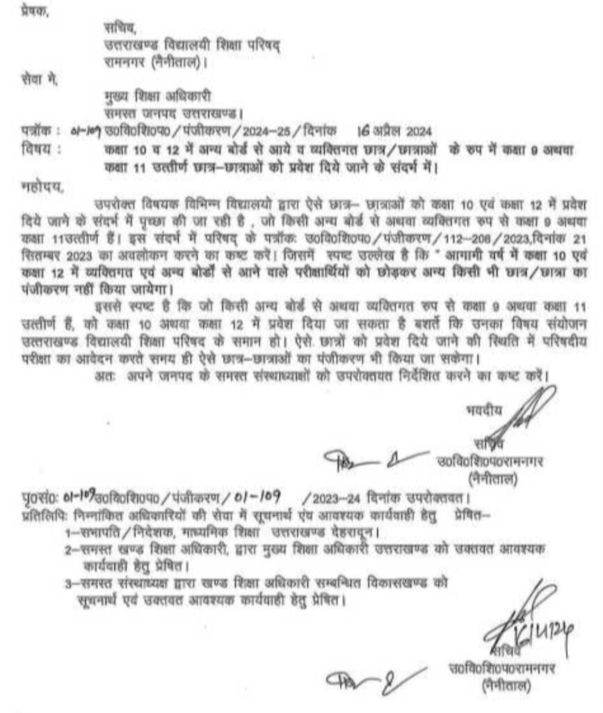 इससे स्पष्ट है कि जो किसी अन्य बोर्ड से अथवा व्यक्तिगत रुप से कक्षा 9 अथवा कक्षा 11 उत्तीर्ण हैं, को कक्षा 10 अथवा कक्षा 12 में प्रवेश दिया जा सकता है बशर्ते कि उनका विषय संयोजन उत्तराखण्ड विद्यालयी शिक्षा परिषद के समान हो। ऐसे छात्रों को प्रवेश दिये जाने की स्थिति में परिषदीय परीक्षा का आवेदन करते समय ही ऐसे छात्र-छात्राओं का पंजीकरण भी किया जा सकेगा। अतः अपने जनपद के समस्त संस्थाध्याक्षों को उपरोक्तवत निर्देशित करने का कष्ट करें।