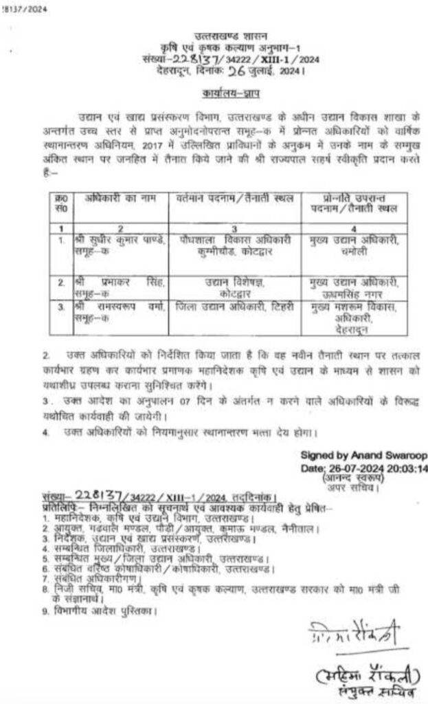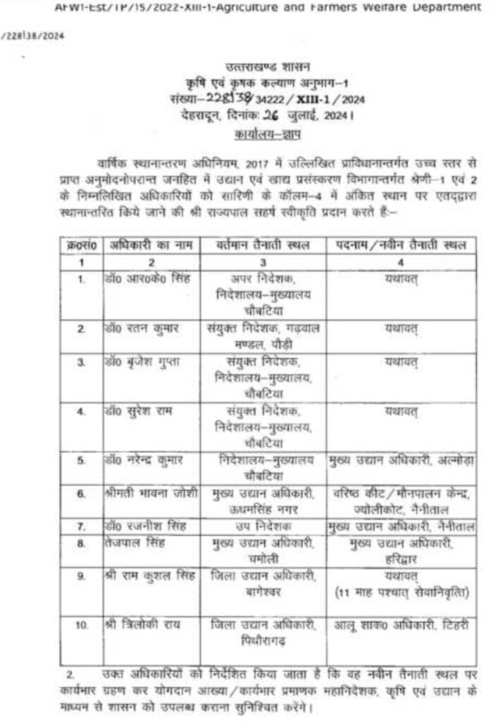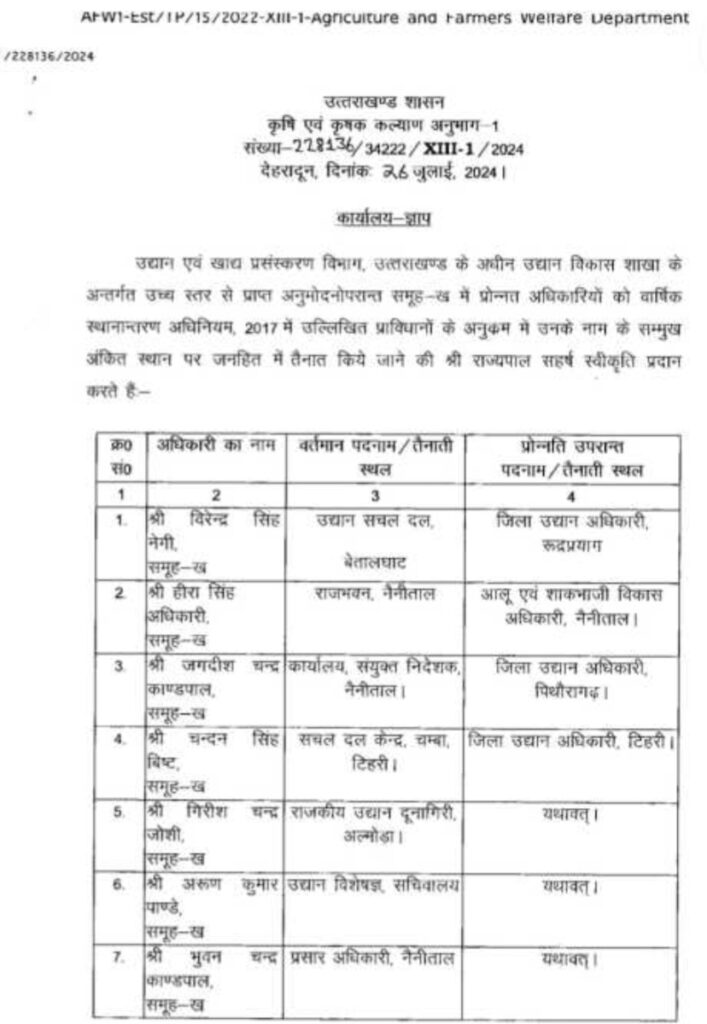 देहरादून। शासन ने उद्यान विभाग में बंपर तबादले किए हैं। उद्यान एवं खाद्य प्रसंस्करण विभाग, उत्तराखण्ड के अधीन उद्यान विकास शाखा के अन्तर्गत उच्च स्तर से प्राप्त अनुमोदनोपरान्त समूह-ख में प्रोन्नत अधिकारियों को वार्षिक स्थानान्तरण अधिनियम, 2017 में उल्लिखित प्राविधानों के अनुक्रम में उनके नाम के सम्म सम्मुख अंकित स्थान पर जनहित में तैनात किये जाने की राज्यपाल सहर्ष स्वीकृति प्रदान करते हैं :