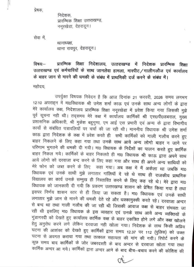 देहरादून। राजधानी देहरादून स्थित शिक्षा निदेशालय में घुसकर प्रारंभिक शिक्षा निदेशक अजय कुमार नौडियाल पर विधायक समर्थकों द्वारा मारपीट की गई जिनसे अजय कुमार नौडियाल गंभीर रूप से घायल हो गये। उनके सर पर चोट आई है। शिक्षा निदेशक को उपचार के लिए कोरोनेशन अस्पताल में भर्ती कराया गया। उनके माथे पर कई टांके लगाए गए है।