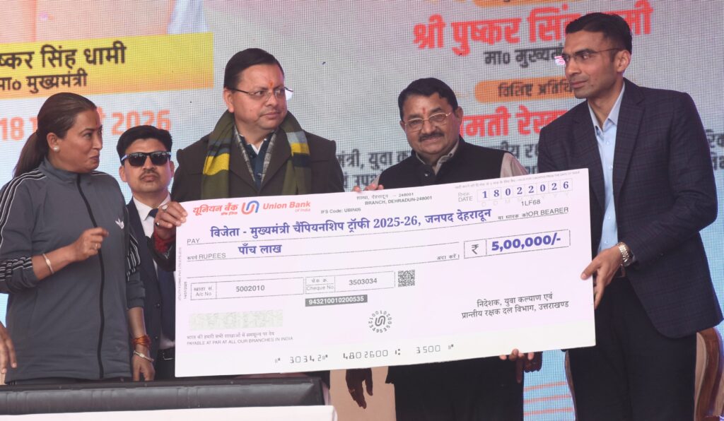 देहरादून। ननूरखेड़ा मिनी स्टेडियम में मुख्यमंत्री चैंपियनशिप ट्रॉफी 2025-26 के राज्य स्तरीय मुकाबले में देहरादून जनपद की टीम विजेता बनी है। विजेता टीम को प्रदेश के मुख्यमंत्री पुष्कर सिंह धामी और कैबिनेट मंत्री रेखा आर्या ने ट्रॉफी एवं 5 लाख रुपये का चेक देकर सम्मानित किया।