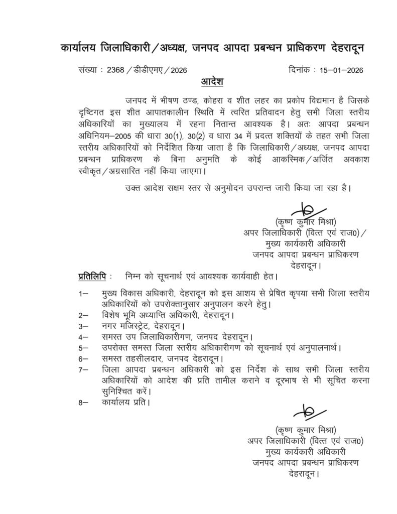 देहरादून: शीतलहर के बढ़ते प्रकोप को देखते हुए जिला स्तरीय अधिकारियों के अवकाश पर रोक