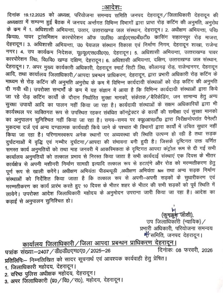 जिला प्रशासन के संज्ञान में आया कि विभिन्न कार्यदायी संस्थाओं द्वारा किये जा रहे रोड़ कटिंग कार्यों के दौरान निर्धारित सुरक्षा मानकों, संकेतक / बैरिकेडिंग, जन सामान्य हेतु अन्य सुरक्षा उपायों आदि का पालन नहीं किया जा रहा है और ना ही कार्यदायी संस्थाओं के सक्षम अधिकारियों द्वारा भी कार्यस्थल पर व्यक्तिगत रूप से उपस्थित रहकर संबंधित कॉन्ट्रेक्टर के कार्यों की समीक्षा एवं सुरक्षा मानको का अनुपालन सुनिश्चित नहीं किया जा रहा है।