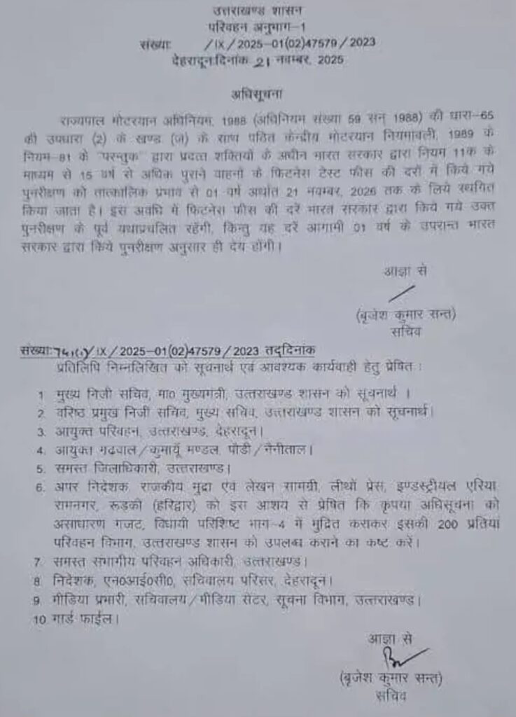 देहरादून। मुख्यमंत्री पुष्कर सिंह धामी ने उत्तराखंड के वाहन स्वामियों को महत्वपूर्ण राहत प्रदान करते हुए पुराने (15 वर्ष) कमर्शियल वाहनों की फिटनेस फीस में वृद्धि को आगामी 21 नवम्बर 2026 तक स्थगित कर दिया है। इस संबंध में परिवहन विभाग द्वारा अधिसूचना जारी कर दी गई है। अधिसूचना सचिव परिवहन बृजेश कुमार संत द्वारा जारी की गई।