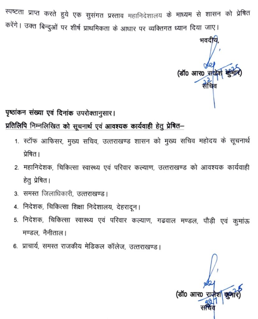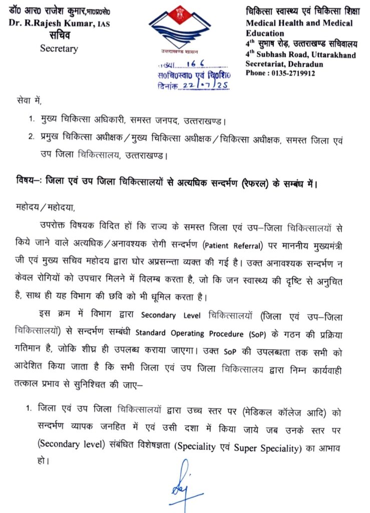देहरादून। मुख्यमंत्री पुष्कर सिंह धामी के निर्देश पर उत्तराखंड शासन ने सरकारी अस्पतालों में मरीजों के अनावश्यक रेफरल पर सख्ती बरतनी शुरू कर दी है। स्वास्थ्य सचिव डॉ. आर. राजेश कुमार ने स्पष्ट किया है कि अब बिना ठोस चिकित्सकीय कारण के किसी भी रोगी को जिला और उप-जिला अस्पतालों से उच्च संस्थानों जैसे मेडिकल कॉलेजों या बड़े अस्पतालों को रेफर नहीं किया जाएगा।