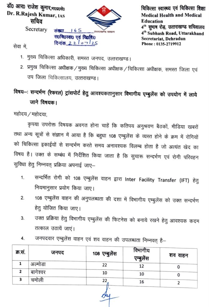 स्वास्थ्य सचिव डॉ. आर. राजेश कुमार ने बताया कि मुख्यमंत्री धामी के निर्देश अनुसार, रेफर मरीजों की आवाजाही में पारदर्शिता लाने के लिए एम्बुलेंस सेवाओं के उपयोग पर भी स्पष्ट गाइडलाइन जारी की गई है। 108 एम्बुलेंस का प्रयोग Inter Facility Transfer (IFT) के तहत ही हो। विभागीय एम्बुलेंस की तैनाती योजनाबद्ध ढंग से की जाए। सभी विभागीय एम्बुलेंस की तकनीकी स्थिति की समीक्षा कर फिटनेस सुनिश्चित की जाए।