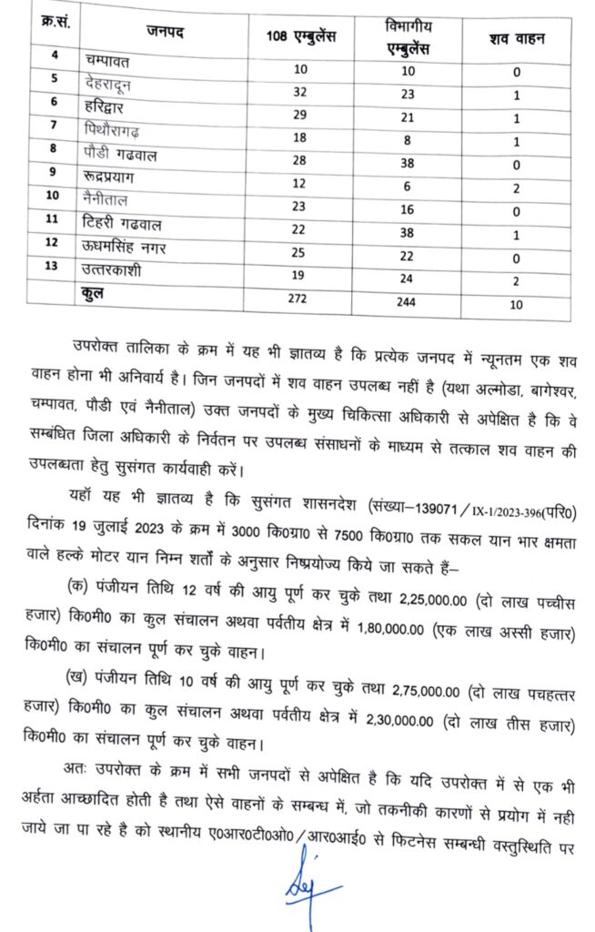वर्तमान में राज्य में कुल 272 “108 एम्बुलेंस”, 244 विभागीय एम्बुलेंस और केवल 10 शव वाहन कार्यरत हैं। कुछ जिलों– जैसे अल्मोड़ा, बागेश्वर, चंपावत, पौड़ी और नैनीताल में शव वाहन नहीं हैं। इन जिलों के CMO को तत्काल वैकल्पिक व्यवस्था सुनिश्चित करने को कहा गया है। स्वास्थ्य सचिव ने बताया कि पुराने वाहन जिनकी रजिस्ट्रेशन आयु 10 या 12 वर्ष पूर्ण हो चुकी है, उन्हें नियमानुसार शव वाहन के रूप में तैनात किया जा सकता है। इसके लिए क्षेत्रवार संचालन व्यय भी निर्धारित कर दिया गया है।