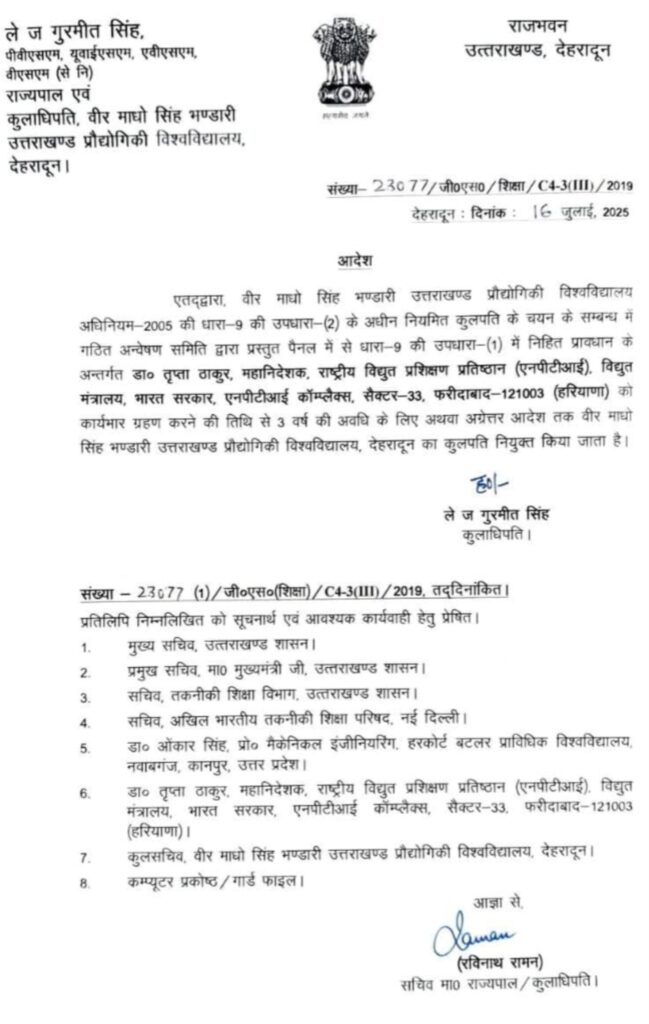 देहरादून। वीर माधो सिंह भण्डारी उत्तराखण्ड प्रौद्योगिकी विश्वविद्यालय (वीएमएसबी यूटीयू) को नया कुलपति मिल गया है। केंद्र सरकार के विद्युत मंत्रालय के अधीन राष्ट्रीय विद्युत प्रशिक्षण प्रतिष्ठान (एनपीटीआई) की महानिदेशक डॉ. तृप्ता ठाकुर को विश्वविद्यालय का कुलपति नियुक्त किया गया है।