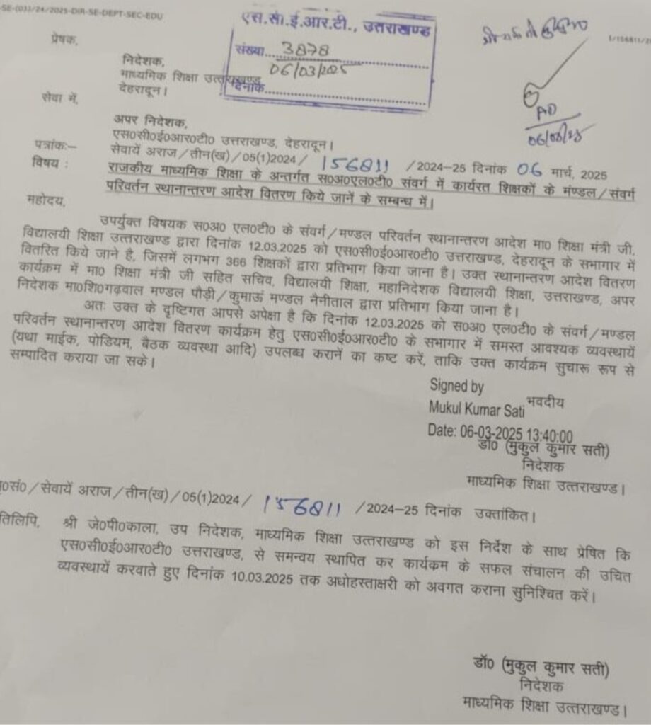 देहरादून। शिक्षा मंत्री डा. धन सिंह रावत 12 मार्च के एससीईआरटी देहरादून के सभागार में सहायक अध्यापक एलटी के संवर्ग/मण्डल परिवर्तन स्थानांतरण आदेश वितरित करेंगे। कार्यक्रम में कुल 366 शिक्षकों को स्थानांतरण आदेश वितरित किए जाएंगे।