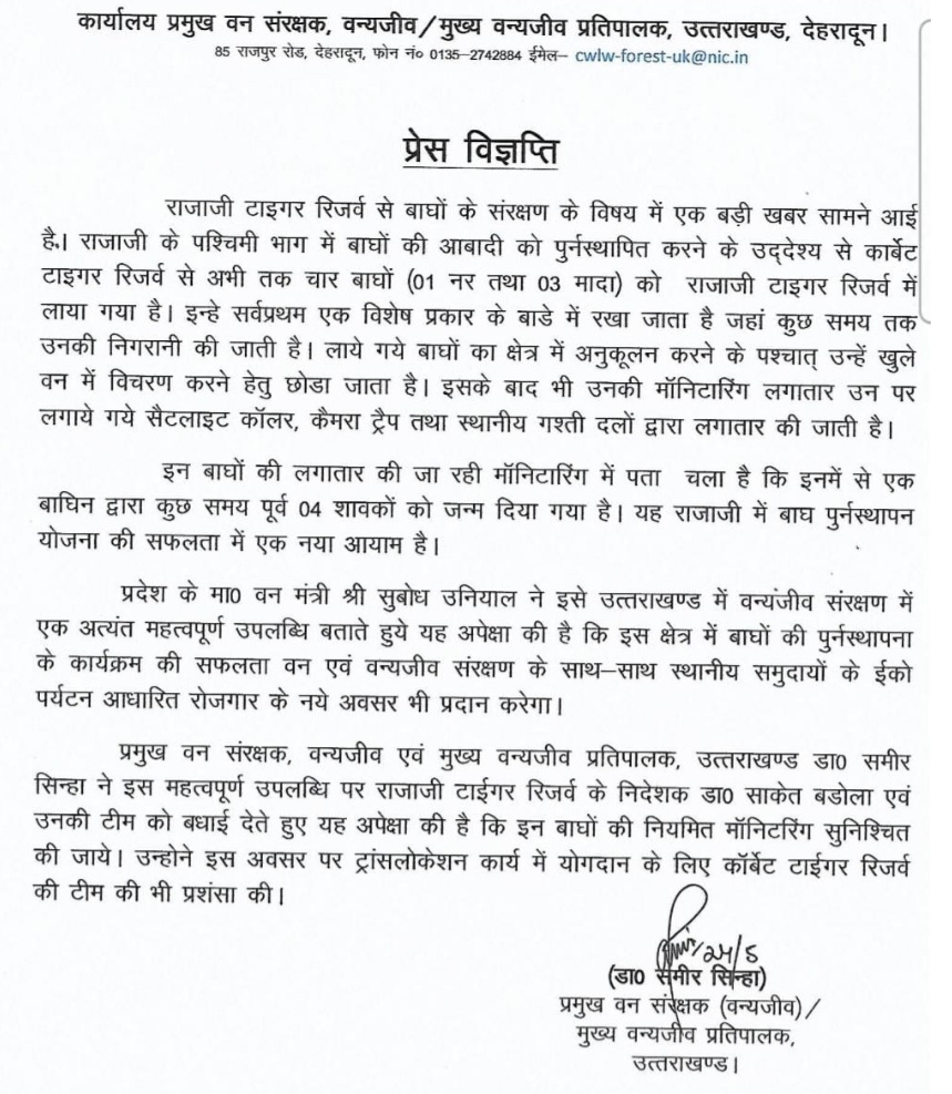 उत्तराखण्ड में वन्यजीव संरक्षण के क्षेत्र में यह एक महत्वपूर्ण उपलब्धि है। इस क्षेत्र में बाघों के पुनर्स्थापन कार्यक्रम की सफलता वन्यजीव संरक्षण के साथ-साथ स्थानीय लोगों को इको पर्यटन आधारित रोजगार के नए अवसर भी प्रदान करेगी।