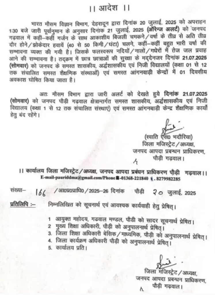 अतः मौसम विभाग द्वारा जारी अलर्ट को देखते हुये दिनांक 21.07.2025 (सोमवार) को जनपद पौड़ी गढ़वाल क्षेत्रान्तर्गत समस्त शासकीय, अर्द्धशासकीय एवं निजी विद्यालय (कक्षा 1 से 12 तक संचालित संस्थाएं) एवं समस्त आंगनबाड़ी केन्द्र शैक्षणिक कार्यों हेतु बंद रहेंगे।