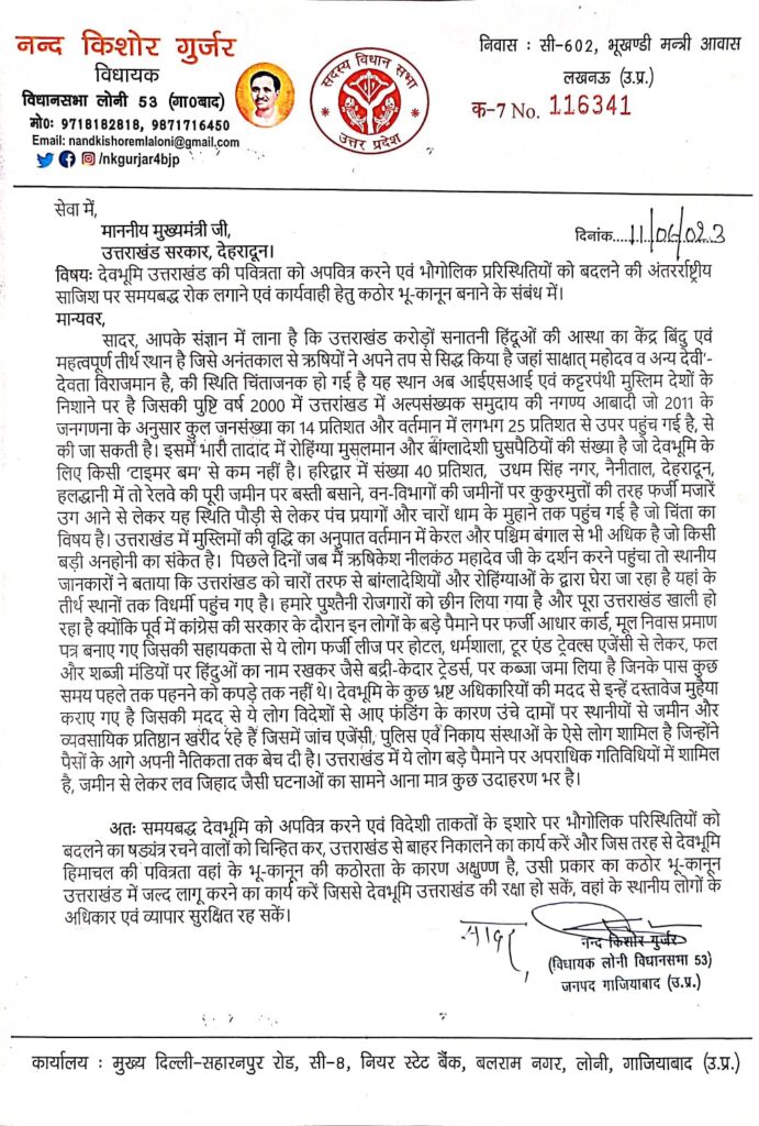 सोशल मीडिया में वाइरल हुए पत्र में विधायक नन्द किशोर गुर्जर ने आरोप लगाया है कि देवभूमि उत्तराखंड में पिछले एक-डेढ दशक में भारी संख्या में रोहिंग्या मुसलमान और बांग्लादेशी घुसपैठियों के घुसने से वहां की जनसंख्या में असंतुलन आ गया है।