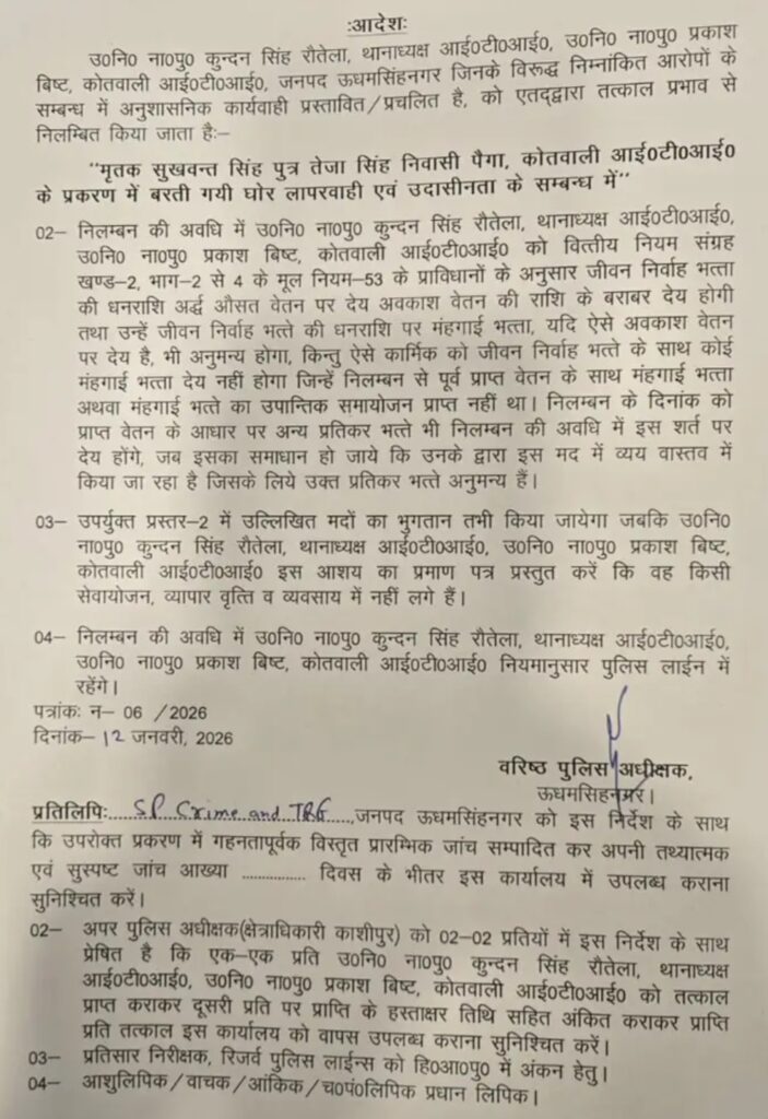 उधमसिंह नगर। काशीपुर किसान आत्महत्या मामले में बड़ी कार्रवाई हुई है। मृतक सुखवंत सिंह पुत्र तेजा सिंह निवासी पैगा के मामले में घोर लापरवाही और उदासीनता बरतने पर वरिष्ठ पुलिस अधीक्षक उधमसिंहनगर ने बड़ी कार्रवाई करते हुए आईटीआई थाना क्षेत्र से जुड़े दो पुलिस अधिकारियों को तत्काल प्रभाव से निलंबित कर दिया है।