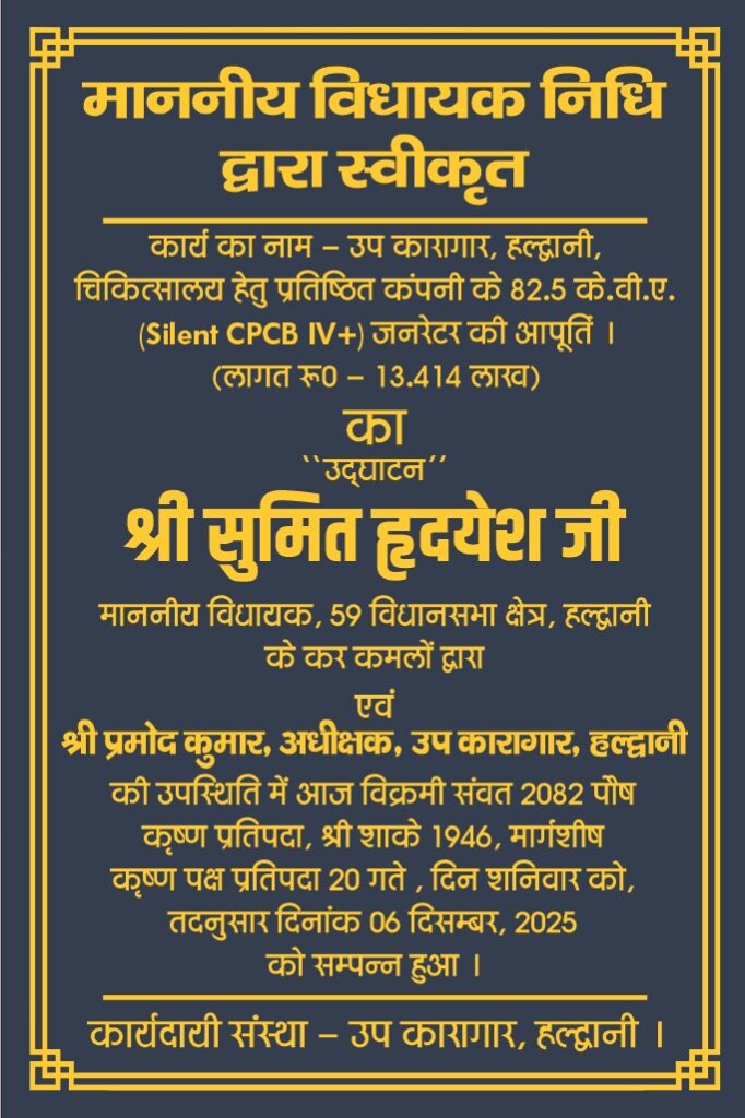 राजकुमार केसरवानी/नैनीताल। हल्द्वानी स्थित उप कारागार चिकित्सालय को विधायक निधि से प्राप्त Hi-Tech 82.5 KVA (Silent CPCB IV+) जनरेटर का लोकार्पण विधायक सुमित हृदयेश द्वारा किया गया। इस अत्याधुनिक जनरेटर के स्थापित होने से अब चिकित्सालय एवं कारागार परिसर में विद्युत आपूर्ति निर्बाध रूप से संभव हो सकेगी।