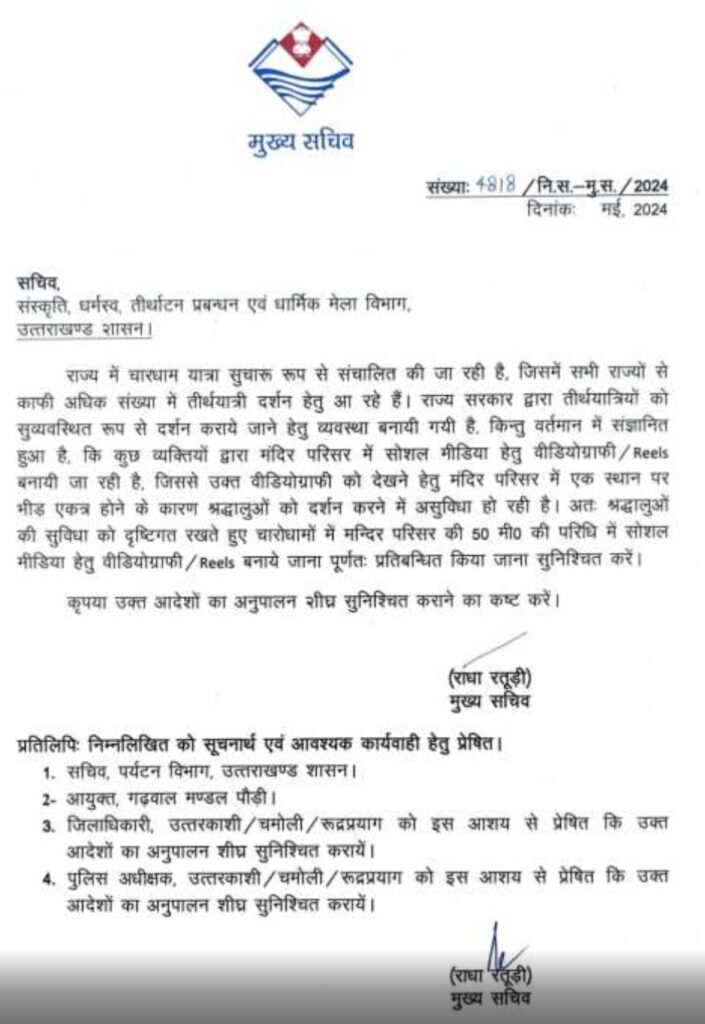 देहरादून। उत्तराखंड राज्य के मुख्य सचिव राधा रतूड़ी ने एक अधिसूचना जारी कर चारों धाम बद्रीनाथ केदारनाथ गंगोत्री गंगोत्री के लिए मंदिर परिसर से 50 मीटर की दूरी तक कोई भी वीडियो फोटो रील बनाना प्रतिबंधित कर दिया है।