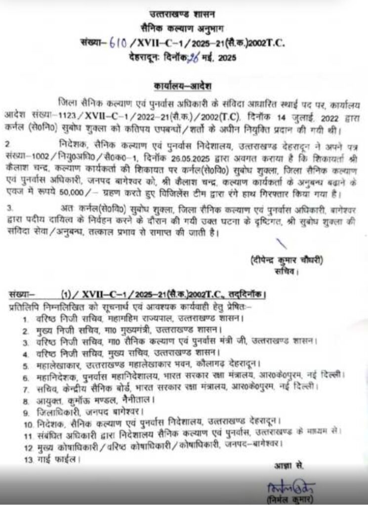 देहरादून। प्रदेश में भ्रष्टाचार के खिलाफ जीरो टॉलरेंस नीति के तहत एक और बड़ी कार्रवाई हुई है। शासन ने बागेश्वर के जिला सैनिक कल्याण अधिकारी कर्नल (सेवानिवृत्त) सुबोध शुक्ला को रिश्वत लेने के मामले में बर्खास्त कर दिया है।
