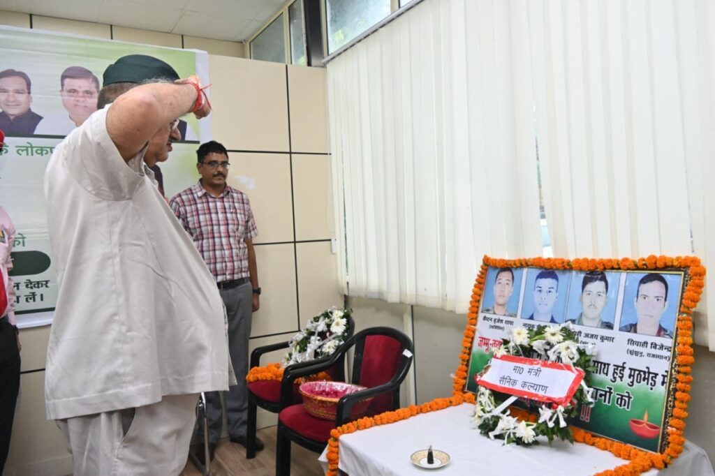 देहरादून। सैनिक कल्याण मंत्री गणेश जोशी ने जम्मू के उरार बागी, डोडा में आतंकियों के साथ मुठभेड़ के दौरान शहीद हुए भारतीय सेना के जवानों की शहादत पर हाथी बड़काला स्थित कैंप कार्यालय में आयोजित श्रद्धांजली कार्यक्रम में प्रतिभाग कर शहीदों को पुष्पचक्र अर्पित कर भावपूर्ण श्रद्धांजलि दी।