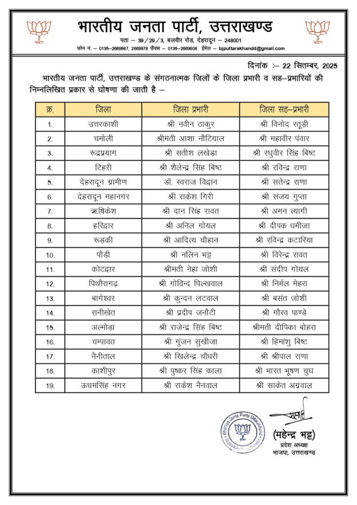 देहरादून। उत्तराखंड भाजपा ने संगठनात्मक जिलों के जिला प्रभारी व सह प्रभारियों की घोषणा कर दी है।