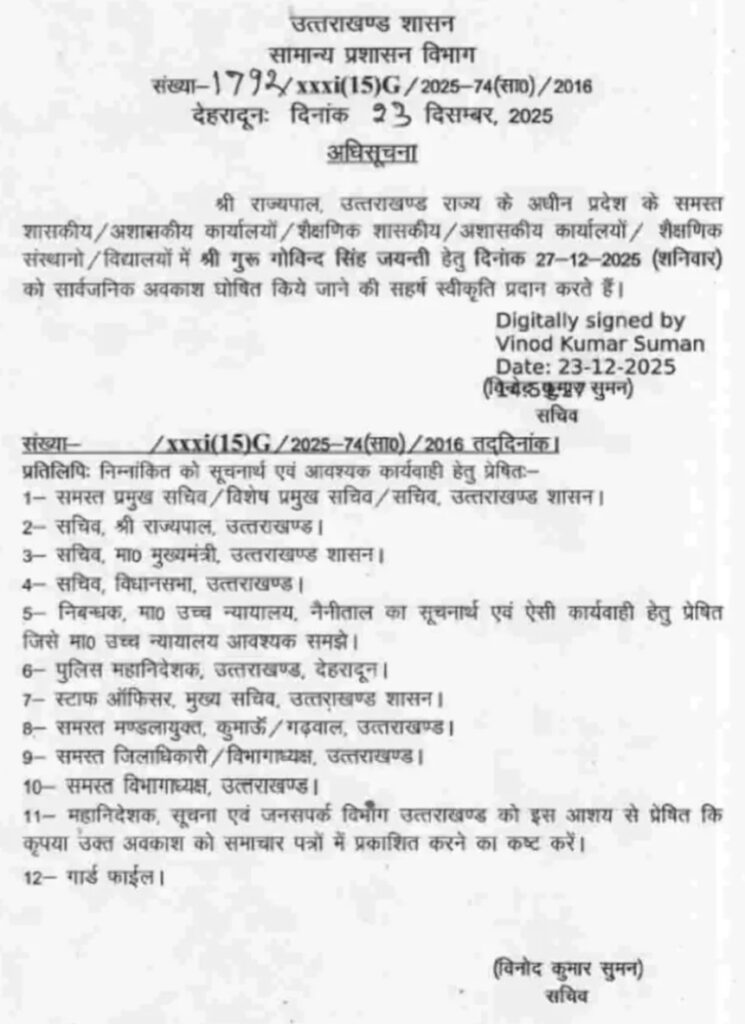 देहरादून। शासन ने गुरु गोबिंद सिंह जी की जयंती के उपलक्ष्य में 27 दिसंबर 2025 को प्रदेश भर में एक दिवसीय सार्वजनिक अवकाश घोषित किया है।