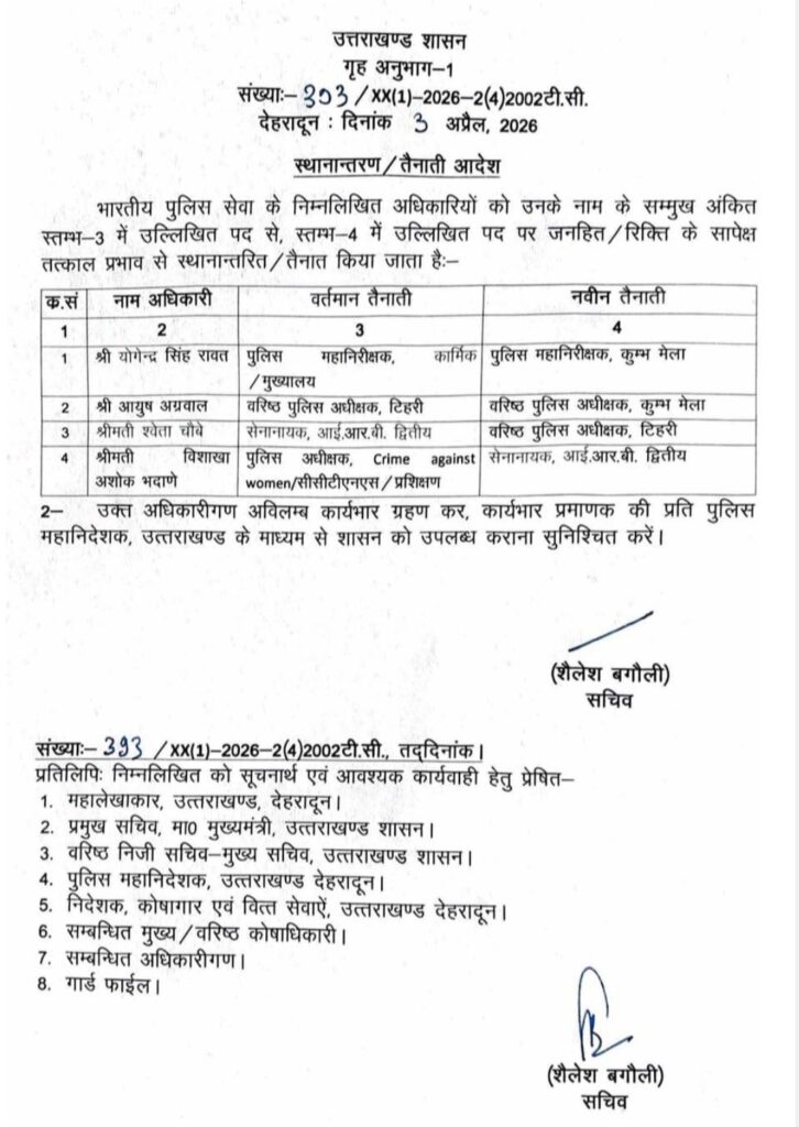 वहीं योगेन्द्र सिंह रावत को पुलिस महानिरीक्षक (कार्मिक/मुख्यालय) पद से हटाकर कुंभ मेला पुलिस महानिरीक्षक (IG) नियुक्त किया गया है। साथ ही आयुष अग्रवाल को वरिष्ठ पुलिस अधीक्षक (SSP) टिहरी से हटाकर कुंभ मेला SSP की जिम्मेदारी सौंपी गई है।