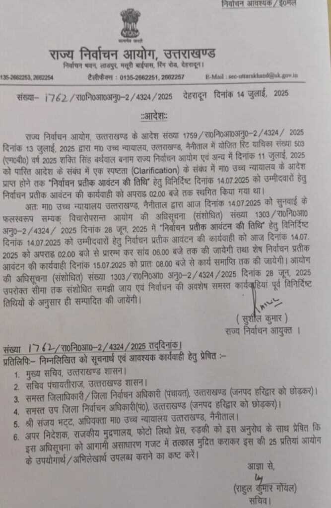 निर्वाचन आयोग द्वारा जारी संशोधित अधिसूचना के तहत 14 जुलाई को पहले चरण में प्रत्याशियों को चुनाव चिन्ह आवंटित किया जाना था। लेकिन नैनीताल हाईकोर्ट में चल रही सुनवाई के चलते आयोग ने 13 जुलाई को चुनाव चिन्ह आवंटन की प्रक्रिया अस्थायी रूप से 14 जुलाई की दोपहर 2 बजे तक स्थगित कर दी थी।