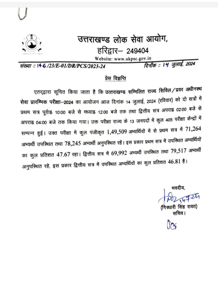 देहरादून। उत्तराखंड लोकसेवा आयोग के सचिव गिरधारी सिंह रावत ने बताया कि उत्तराखण्ड सम्मिलित राज्य सिविल / प्रवर अधीनस्थ सेवा प्रारम्भिक परीक्षा-2024 का आयोजन आज दिनांक 14 जुलाई, 2024 (रविवार) को दो सत्रों में प्रथम सत्र पूर्वाह्न 10:00 बजे से मध्याह्न 12:00 बजे तक तथा द्वित्तीय सत्र अपराह्न 02:00 बजे से अपराह्न 04:00 बजे तक किया गया। उक्त परीक्षा राज्य के 13 जनपदों में कुल 405 परीक्षा केन्द्रों में सम्पन्न हुई। उक्त परीक्षा में कुल पंजीकृत 1,49,509 अभ्यर्थियों में से प्रथम सत्र में 71,264 अभ्यर्थी उपस्थित तथा 78,245 अभ्यर्थी अनुपस्थित रहें। इस प्रकार प्रथम सत्र में उपस्थित अभ्यर्थियों का कुल प्रतिशत 47.67 रहा। द्वित्तीय सत्र में 69,992 अभ्यर्थी उपस्थित तथा 79,517 अभ्यर्थी अनुपस्थित रहे, इस प्रकार द्वित्तीय सत्र में उपस्थित अभ्यर्थियों का कुल प्रतिशत 46.81 है।
