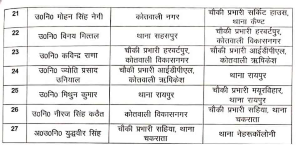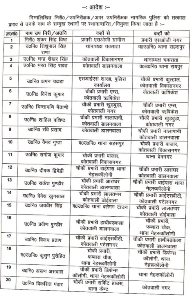 देहरादून। कानून व्यवस्था को बनाए रखने के लिए पुलिस कप्तान अजय सिंह ने कई पुलिस अधिकारियों को इधर-उधर किया है। एसएसपी ने एक निरीक्षक, 42 उपनिरीक्षक और 5 अपर उपनिरीक्षक का ट्रांसफर किया है। साथ ही एसएसपी ने सभी स्थानांतरित अफसरों को जल्द कार्यभार लेने के निर्देश दिए हैं। एसएसपी ने अधीनस्थ अधिकारियों को कानून व्यवस्था और कामकाज के आधार पर तैनाती दी है।